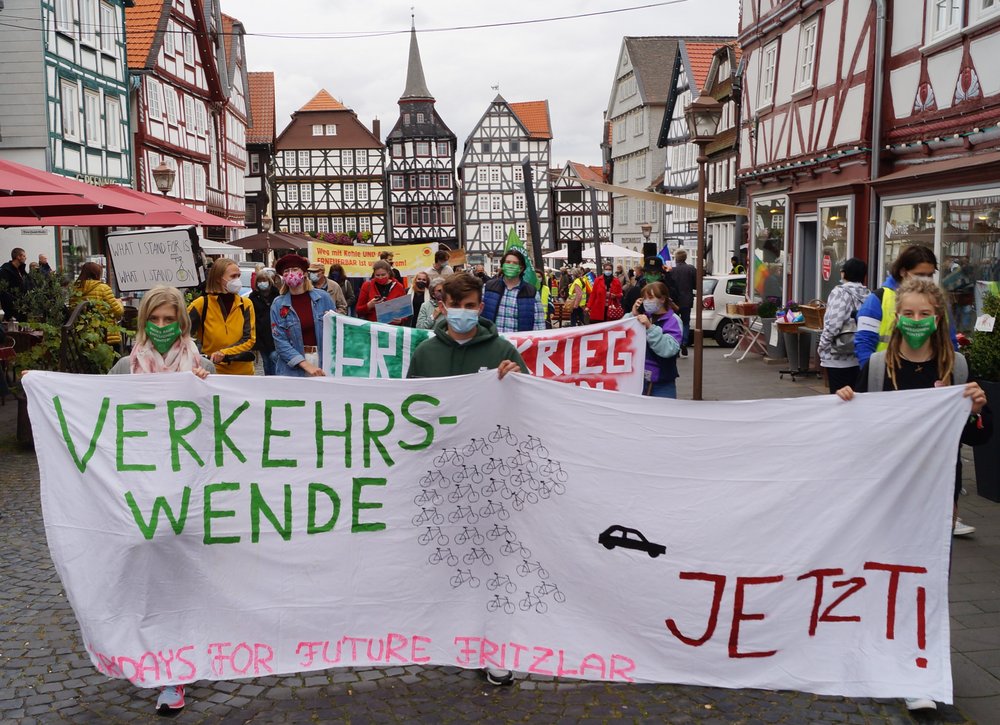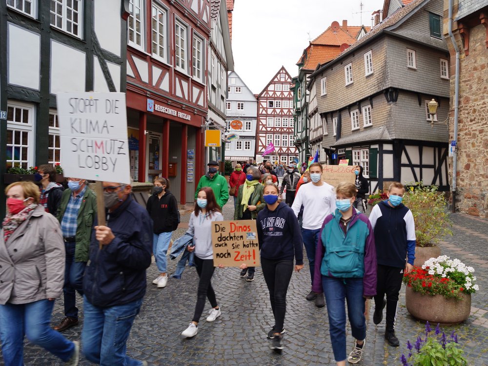 "Wir sind wieder da!" war die Feststellung nach einer mehrmonatigen Pause von "Fridays for future". Ursache dafür war die Corona-Pandemie. Mit phantasievollen Plakaten demonstrierten nach Angaben der Veranstalter mehr als 200 Teilnehmer am Freitag, d. 25.09.2020 in Fritzlar, um eine aktive Klimapolitik einzufordern. Eine Verkehrswende wurde gefordert. Die Massentierhaltung wurde kritisiert. Der Zusammenhang zwischen Friedens- und Umweltpolitik wurde bei der Kundgebung dargestellt.