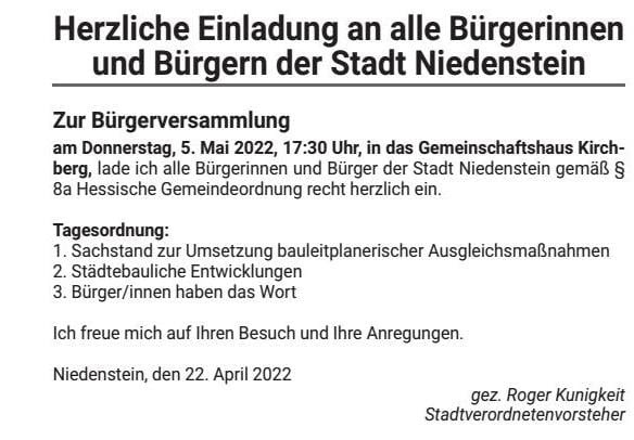 Am Donnerstag, den 5. Mai 2022 findet eine Bürgerversammlung ab 17 Uhr im DGH Kirchberg statt. Der Niedensteiner Stadtverordnetenvorsteher hat dazu eingeladen. Themen können vorgeschlagen werden (Anregungen). Die Anregungen an den Stadtverordnetenvorsteher können über das Rathaus eingereicht werden. Diese Anregungen werden vermutlich im Tagesordnungspunkt 2 "Bürger*innen haben das Wort" behandelt.