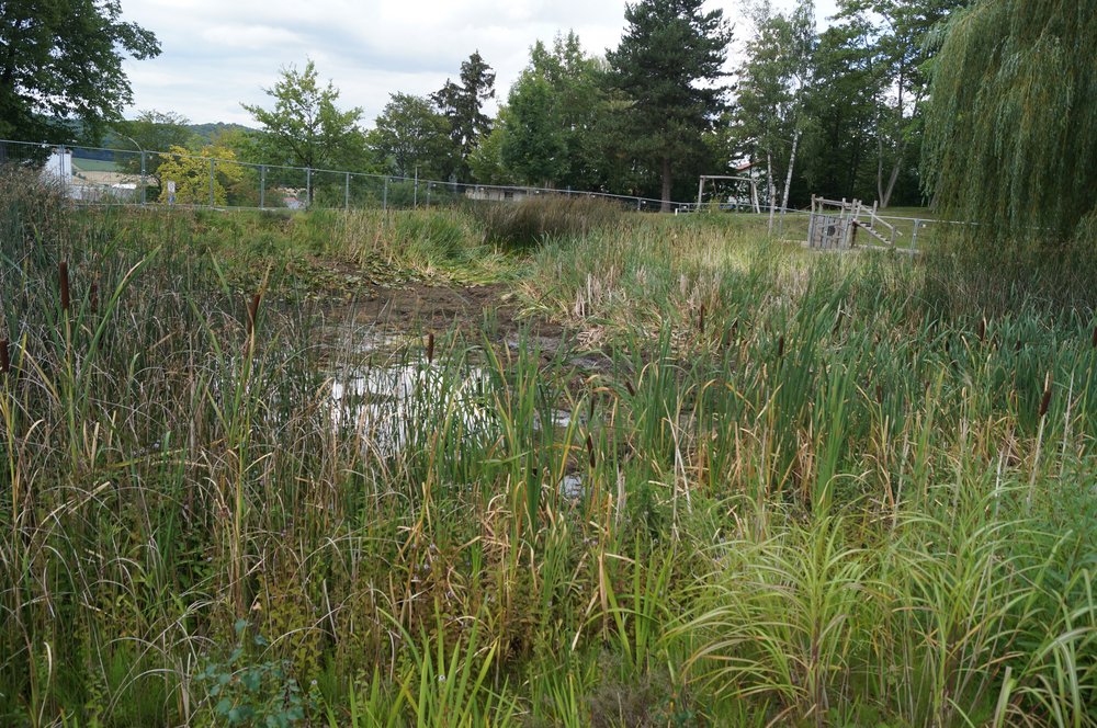 Wird nun die Teichanlage neu geplant, schlagen wir GRÜNE vor, ein naturnahes Flachgewässer, dass zumindest im Frühjahr Wasser führt und zum Laichgewässer wird, anzulegen. Es könnte von einem kleinen Holzgeflechtzaun o.ä. umgeben sein, durchgängig für die Laichwanderungen der Amphibien. Eine Infotafel mit Erläuterung der Arten und ihrer Lebensweise als Erklärung und ein Lauschtrichter könnten leicht verständliche Information vermitteln.