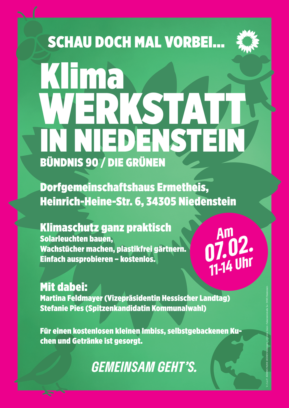 Am Samstag, d. 07.02.2026 bieten BÜNDNIS 90/DIE GRÜNEN Niedenstein einen Mitmachtag zum Thema „Klimaschutz und Nachhaltigkeit mal ganz praktisch“ an.