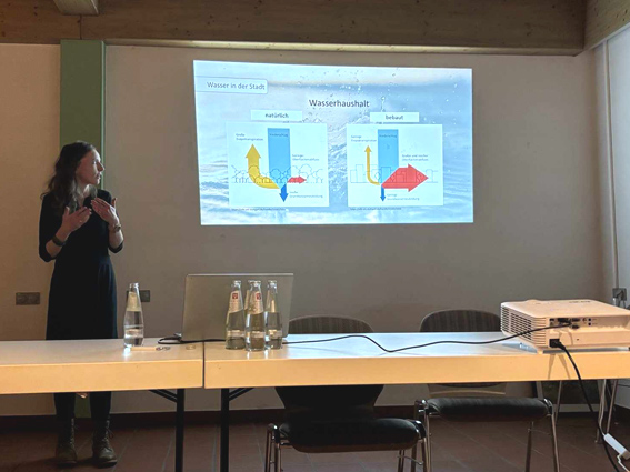 Frau Katharina Nießner, Expertin für Klimawandelfolgen, Stadtplanerin und Biologin, führte in ihrem ca. 1-stündigen Vortrag die verschiedenen Gefahren, aber auch Nutzungsmöglichkeiten von Regenwasser aus. Auf verschiedenen Folien machte Sie deutlich, dass wir nicht nur Klimaschutz, sondern auch Klimaanpassung benötigen, da das 1,5 Grad Ziel sicherlich überschritten und Starkregenereignisse sich häufen werden.