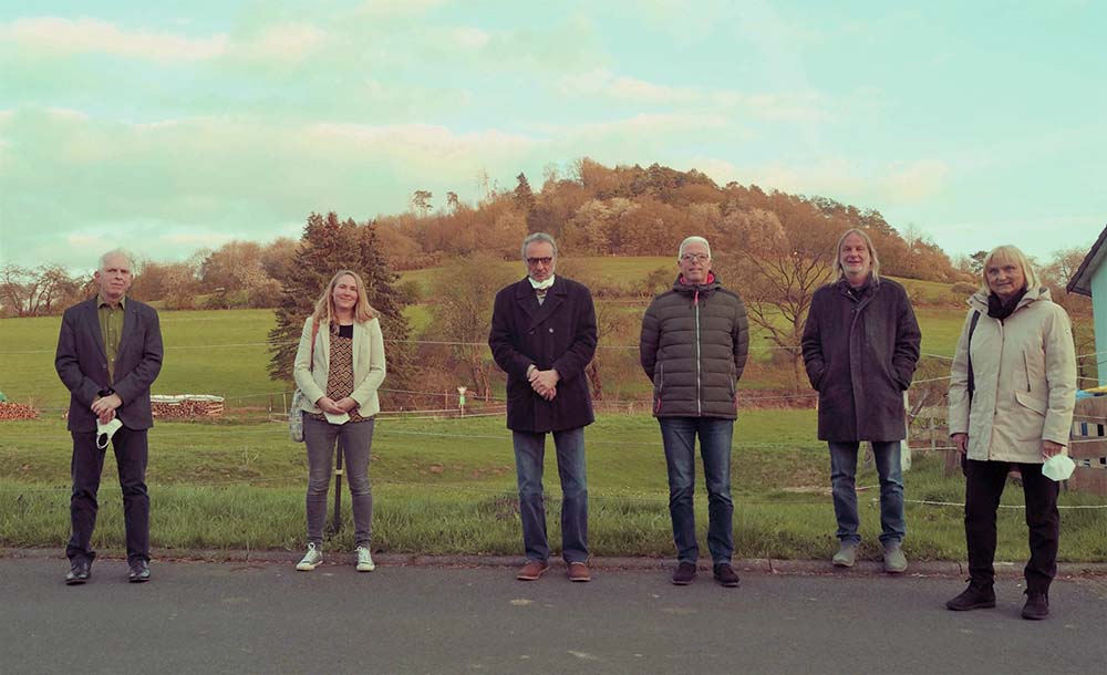 Zu sehen sind v.l. Jörg Warlich, Christine Glück, Rolf Wölling, Siegfried Schäfer, Niklas Sobotta und Dr. Bettina Hoffmann vor der 1. Sitzung der Stadtverordnetenversammlung in Kirchberg (22.4.2021)